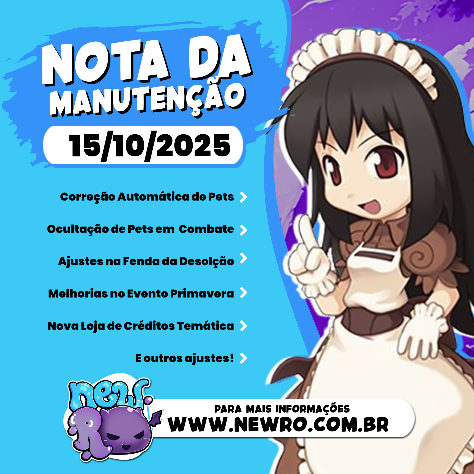 Administrador ADM New Posted October 15 Administrador Report Share Posted October 15 Olá galera do NewRO, tudo certo? Quarta-feira chegou com uma manutenção que corrige e facilita vários aspectos do jogo, além de novos itens para vocês. Confiram tudo abaixo. Correção Automática de Pets com Problema de Incubação Implementamos uma correção automática que resolve o problema de pets que anteriormente não podiam ser chocados corretamente ao utilizar a incubadora. Agora, todos os pets afetados por esse bug serão automaticamente corrigidos ao tentar chocá-los, garantindo que você possa desfrutar de seus companheiros sem frustrações. Ocultação Inteligente de Pets em Zonas de Combate Para melhorar a performance e visibilidade durante batalhas intensas, pets agora são automaticamente ocultados ao entrar em áreas PvP e GvG. Importante: seus atributos e bônus continuam 100% ativos - apenas o modelo visual é temporariamente removido para reduzir a poluição visual em combate. Ajustes nas Taxas de Drop da Fenda da Desolação Após análise do feedback da comunidade, facilitamos significativamente as taxas de drop das Cartas A e Carta P na instância Fenda da Desolação. Esses ajustes tornam a progressão mais fluida e recompensadora para jogadores que estão farmando esses itens essenciais. Evento de Primavera 2025 - Melhorias Substanciais Triplicação das Recompensas de Missão Diária A missão diária "Primavera Grandiosa" agora recompensa 3 unidades ao invés de apenas 1. Essa mudança representa um aumento de 300% nas recompensas, permitindo que jogadores casuais também possam aproveitar melhor o evento sem precisar dedicar tempo excessivo. Dobro de Flores Glaciais no Jardim Congelado Cada conclusão da instância Jardim Congelado agora concede 2 Flores Glaciais ao invés de 1. Combinado com as outras mudanças, isso facilita consideravelmente o farm dos itens exclusivos do evento. Nova Loja de Créditos Temática Inauguramos uma loja especial de Créditos contendo diversos itens temáticos de Primavera, oferecendo mais opções de obtenção para jogadores que preferem rotas alternativas de progressão. Novo Conteúdo End-Game Novas Asas com função de tanques especialmente desenvolvidas para builds de tanque no conteúdo end-game. Essas asas oferecem atributos otimizados para maximizar a sobrevivência e utilidade em competições. Caixa da Instância Jardim Congelado Concede prêmios da Instância Jardim Congelado quando aberta Caixa da Raide Kades Concede prêmios da Raide Kades 2025 quando aberta Caixa da Raide Gioia Concede prêmios da Raide Gioia 2025 quando aberta Caixa da Raide Ktullanux Concede prêmios da Raide Ktullanux 2025 quando aberta Pet Sproutring Aumenta a chance de drop das Raides Primavera 2025 em 100% Pet Jack Halloween Aumenta a chance de drop das Raides Primavera 2025 em 100% Asas Divinas Adicionado em seus 9 elementos Elmo Nokken Asas Nokken Chamas Nokken Ajuste na fabricação de itens Mid-game e Early-Game na Loja Como parte de nossa iniciativa de tornar o conteúdo early-game mais acessível, reduzimos a quantidade de cartas da Fenda da Desolação necessárias para craftar alguns itens que consideramos itens de progressão inicial. Feedbacks Estas mudanças refletem nosso compromisso contínuo em melhorar a experiência de jogo baseando-nos no feedback da comunidade. O foco principal desta atualização foi facilitar a progressão durante o evento de Primavera 2025. Agradecemos a paciência e os reports detalhados que tornaram essas correções possíveis! Atenciosamente, NewRO. 1 1 1 Quote Link to comment Share on other sites More sharing options...
