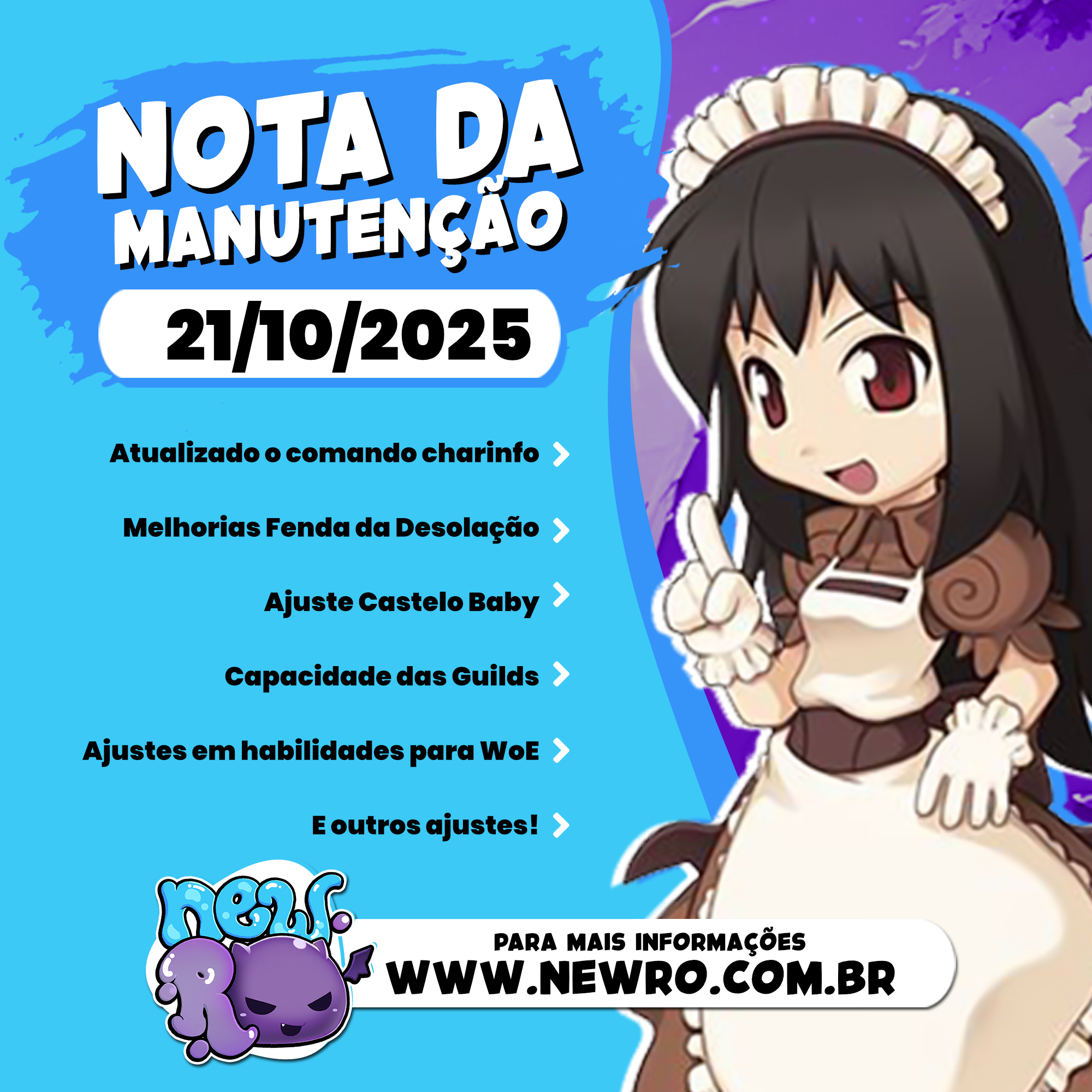 Game Masters DEV Heimdall Posted October 21 Game Masters Report Share Posted October 21 Olá NewRO, tudo certo? Esperamos que sim! Hoje chega mais uma manutenção visando melhorar ainda mais o jogo. Confira abaixo todas informações: 🔹Atualizado o comando charinfo Foi adicionado no comando alguns bônus que não estavam na lista para um melhor estudo de builds e estratégias: Redução do Dano Base Redução de Classe Dano em Classe _________________ 🔹Fenda da Desolação Assim como na última manutenção, estamos melhorando ainda mais a experiência do usuário ao participar dessa instância. Confira as alterações: Melhorado o drop da vogal A. Agora ela está com a mesma chance de sair das outras 6 cartas; Aumentado o dano do jogador em todos os 50 andares em 100%; Diminuído alguns atributos do MvP final que fazia ter muita esquiva; Informação extra: O monstro tem propriedade Shadow 4 e toma dano extra de sagrado. _________________ 🔹Castelo Baby Corrigida a entrada de personagens 'grandes' na WoE Baby. _________________ 🔹Capacidade de clãs em 15 membros Analisamos o cenário do momento e decidimos reduzir a capacidade dos Clãs para 15 pessoas cada. Essa mudança busca manter o equiíbrio das forças. Estamos sempre monitorando e posteriormente podemos reverter essa mudança conforme o engajamento aumente na WoE. _________________ 🔹Guerra do Emperium Algumas habilidades foram transformadas em buffs para melhorar o desempenho dos clãs dentro da Guerra do Emperium: Provocar Enlouquecedor Eske _________________ 🔹PvP Master Adicionado no PvP Master a opção de teletransporte para a arena do evento primavera. _________________ 🔹Missão Diária - Evento Primavera As missões diárias foram ajustadas e agora podem ser repetidas livremente, permitindo que os jogadores farmem o item Primavera Grandiosa. Entretanto, o progresso para obter o visual continuará contando apenas 1 por dia. _________________ 🔹Arena PvP – Evento Primavera A Arena PvP disponível durante o evento de Primavera foi reformulada e agora funciona exclusivamente no modo Extreme. Representando a troca de estação, inicialmente será arena inverno e após alguns dias trocaremos para arena primavera. _________________ 🔹Atualização do Gepard Shield O Gepard Shield foi atualizado para sua versão mais recente, trazendo melhorias de segurança e novas proteções contra os métodos de cheat e manipulação detectados nas últimas semanas. _________________ 🔹Otimização nas atualizações do cliente A partir desta manutenção, o tempo de atualização do cliente será significativamente reduzido. Foram implementadas otimizações na forma como os arquivos são entregues e atualizados, garantindo mais rapidez e menos espera para os jogadores. _________________ 🔹Correção da bandeira do Clã TOP 1 do Evento de Primavera Corrigido um problema visual que impedia a exibição correta da bandeira do clã do evento de Primavera em determinados locais do jogo. O emblema agora é mostrado corretamente em todos os pontos. _________________ 🔹Placares Os placares oficiais do Evento de Primavera estão sendo ativados! Agora os jogadores poderão acompanhar seu desempenho em tempo real e disputar posições nos principais rankings da temporada. 🔹Placares das Raides: Raide Kades Prove sua eficiência derrotando Kades no menor tempo registrado. Raide Gioia Prove sua eficiência derrotando Gioia no menor tempo registrado Raide Ktullanux Prove sua eficiência derrotando Ktullanux no menor tempo registrado. Com a ativação dos placares das raides, premiações especiais serão distribuídas aos TOP 1 de cada categoria ao final do evento — cada vencedor receberá 30 Bilhetes de Créditos (BC) como recompensa por seu destaque! 🔹Placar PvP Os jogadores que dominarem a arena irão se classificar para o Torneio da Temporada por meio do placar da primavera. Por tanto, dedique-se na nova arena PvP e garanta a classificação para o nosso torneio que irá valer Coroa Exclusiva e premiação em Pix. 🔹Placar de Guild Reúna sua guilda, domine as Dungeons de Castelos e prove sua força eliminando o máximo de Super possível. Mostre quem realmente comanda o campo de batalha! Para a guild TOP 1, será distribuído uma aura exclusiva como recompensa por seu destaque! Observação: O farming do evento continuará ativo, porém os placares serão finalizados no dia 21 de novembro. Aproveite esse período para garantir sua colocação! _________________ 🔹Review da Staff Atenciosamente, NewRO. Quote Link to comment Share on other sites More sharing options...