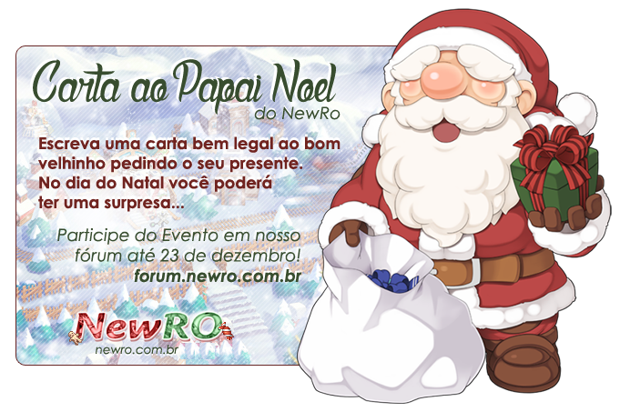 Game Masters GM Muzan Posted December 10, 2025 Game Masters Report Share Posted December 10, 2025 Ho-Ho-Ho! Alguém viu o Papai Noel por aí? Nesta época do ano, o bom velhinho não tem descanso, pois chegou a hora de ler muitas cartinhas e se preparar para presentear. Neste ano, o Papai Noel tem uma parada obrigatória no Natal: o NewRo Portanto estamos coletando as cartas de nossos jogadores e enviando diretamente ao querido Noel, que irá escolher uma delas e contemplar o autor com o tão sonhado presente. Não fique de fora! Escolha o seu presente e escreva a carta da forma mais especial que conseguir! 💝REGRAS - Cada carta deve conter no máximo 1.000 caracteres; Você pode utilizar este site ou outra página/programa para verificação. - Só é possível participar uma vez e com apenas uma carta, que deve ter como objetivo pedir o presente; - A escolha do presente é livre, porém o mesmo deve ser acessível dentro da realidade do servidor. Desta forma, tenham bom senso; - As cartas que não sigam as regras do servidor ou que distorçam o objetivo/tema do evento serão desclassificadas; - É proibido editar o seu post. Caso precise modificar algo, poste novamente avisando que aquela é a participação correta. - Não pesa nada absurdo para o papai Noel escolha bem o que você vai pedi 🍪DATA DE ENCERRAMENTO - 25 de dezembro de 2025. 🎀PREMIAÇÃO - O presente escolhido na carta do vencedor. 🎁EXEMPLO DE POSTAGEM Nick: [GML] Muzan Servidor: NewRo Presente: [5000] Bilhete de Créditos (Carta com até 1.000 caracteres) Feliz Natal a todos! Em caso de dúvidas, podem postar aqui ou me enviem uma mensagem privada. Posts não relacionados ao tópico ou que sejam contra as regras do servidor serão deletados e seus autores punidos. At, Equipe NewRo. Link to comment Share on other sites More sharing options...